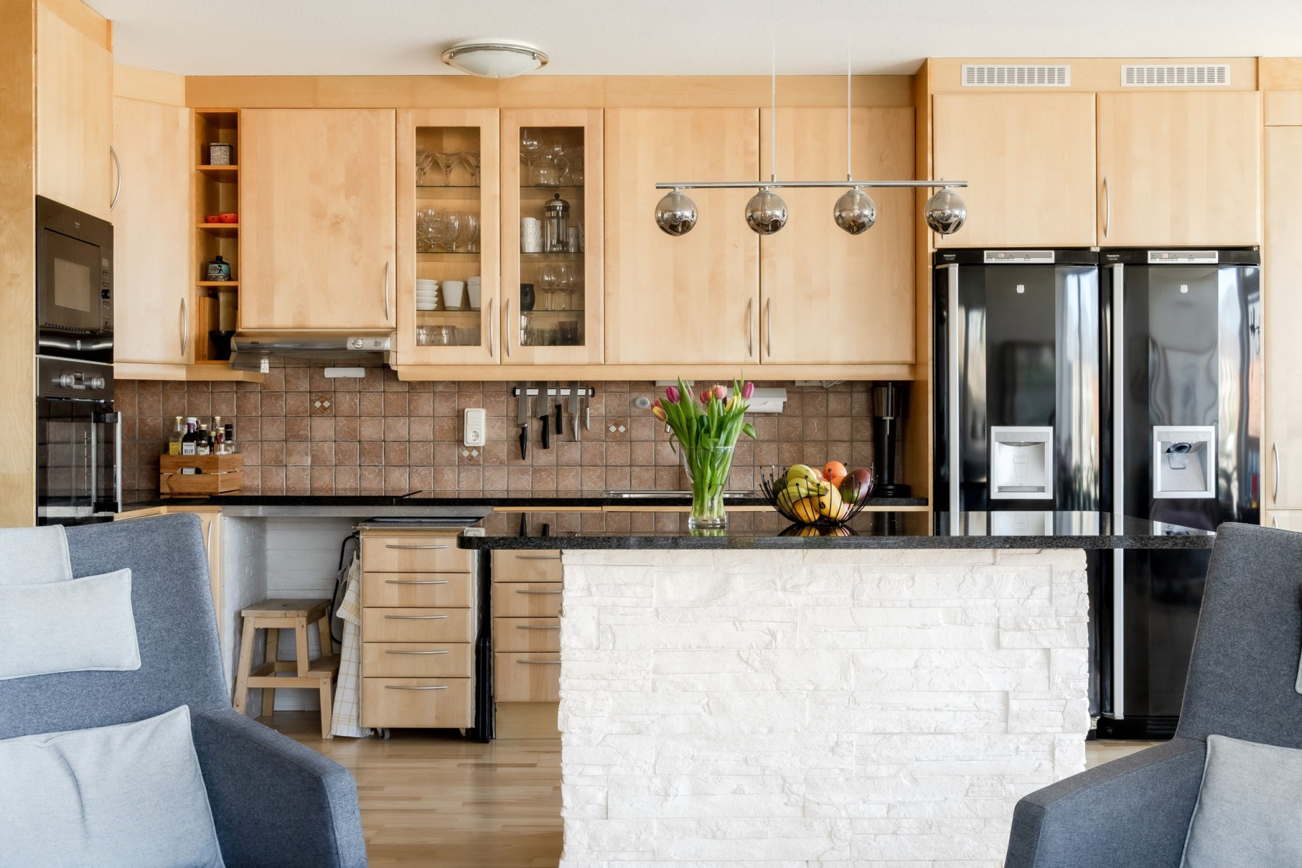 Kök och vardagsrum i öppen planlösning med parkettgolv, stora fönsterpartier mot havet i väster, utgång till den stenlagda uteplatsen med markis samt matplats invid fönster. Köket har massiva skåpsluckor i björk samt köksbänkar i granit. Köksutrustning i form av kyl, frys, induktionshäll, fläkt, diskmaskin, inbyggnadsugn och mikro.